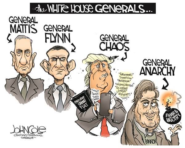 特朗普內閣曾被戲稱為“將軍內閣”,一度有兩個上將(國防部長馬蒂斯、國土安全部長後白宮辦公廳主任凱利)和一箇中將(國家安全顧問弗林,後由麥克馬斯特接替,同為中將)。內務部長辛基是海軍中校,不是將軍,但也是軍人出身。在麥克馬斯特之前,曾考慮過哈沃德海軍中將,不過老傢伙老奸巨猾,推掉了。隨着馬蒂斯的離去,現在一個將軍也沒有了。