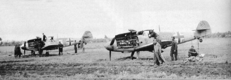 Me109在東線的野戰機場作發動機檢修,注意,戰鬥機的起落架停在特意挖好的溝裏,這個“狗吃屎”的姿勢是為了校正航炮的瞄準