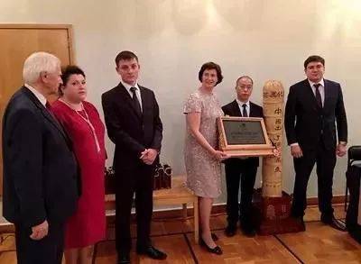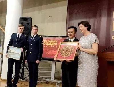 中俄兩國嘉賓致辭結束後,列寧紀念館館長拉里娜·麗姬婭·根納季耶夫娜和韶山毛澤東同志紀念館副館長龍劍宇分別代表兩館互贈禮品。