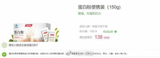 咱們再以湯臣倍健蛋白粉舉例,就138塊錢150克蛋白粉,號稱增強免疫力!心虛不心虛?有這個錢吃高蛋白的食物比買蛋白粉強。