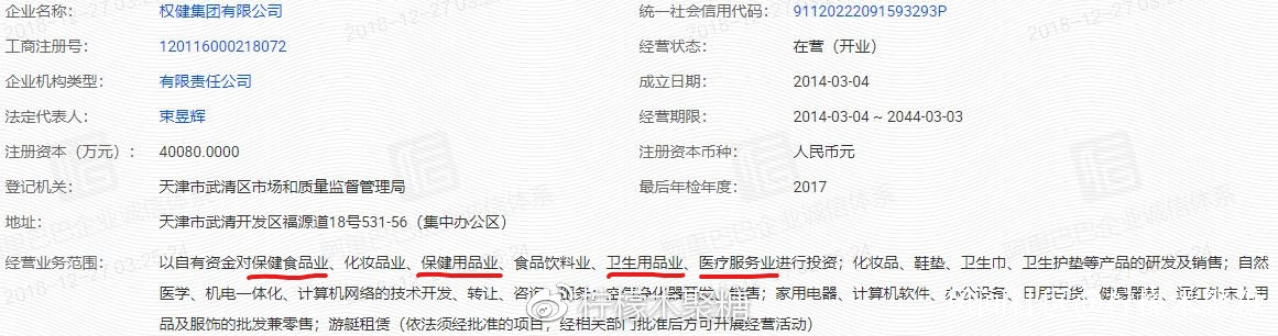在這個構架下,權健對於健康領域主要涉足兩個部分,一個是保健品,另一個是醫療服務。咱們先扒大家比較關注的保健品領域,權健集團的保健品業務主要依賴於一個生產主體,也就是天津市權健自然醫學科技發展有限公司,在這個主體之下,權健集團有着源源不斷的產品產出,以便進行銷售。