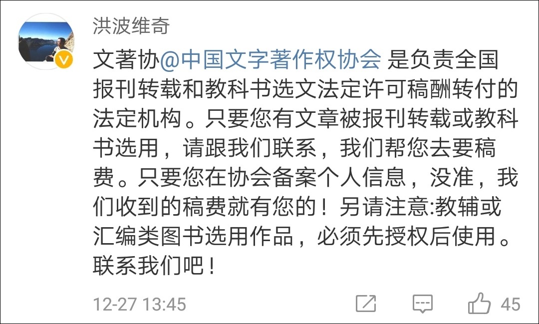 而文著協(中國文字著作權協會)總幹事,微博大V“洪波維奇”(張洪波)也留言説: