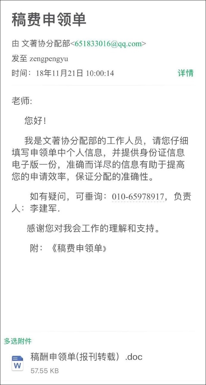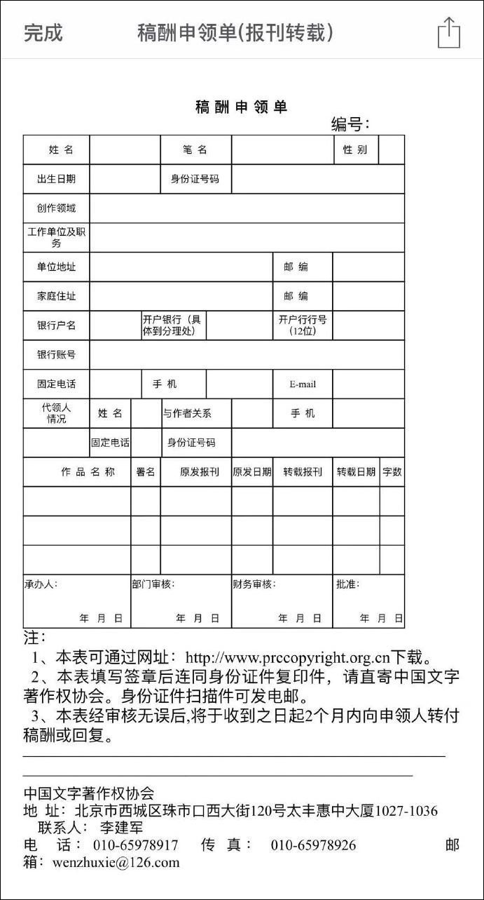 隨即文著協方面發來了一封郵件,裏面是一張需要填報的稿酬申領單。我看了一度有些納悶:不就是領個轉載稿酬,為什麼還這麼麻煩?