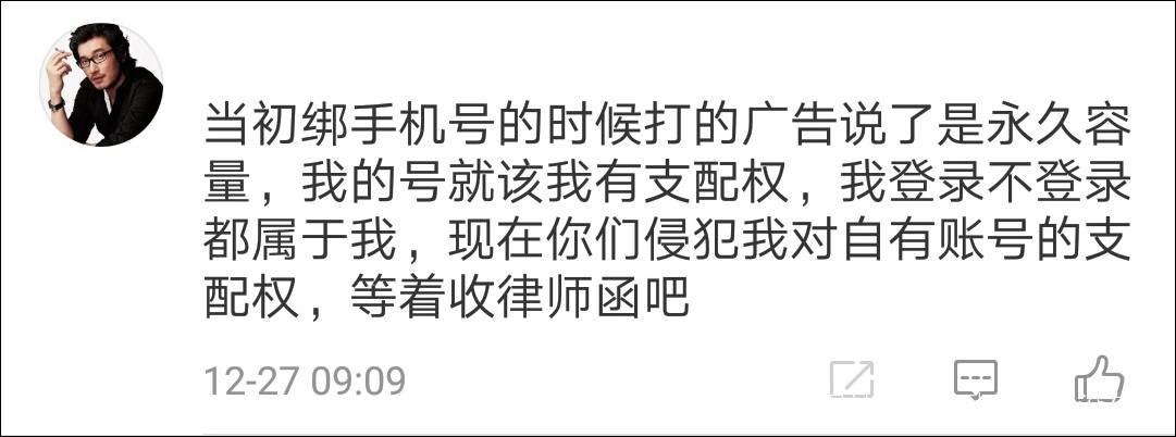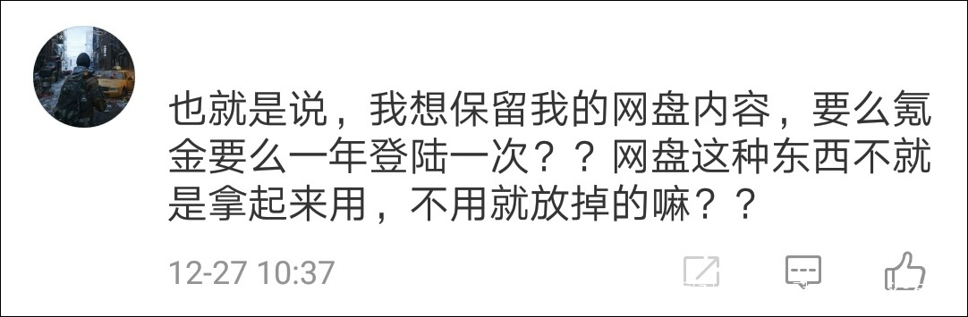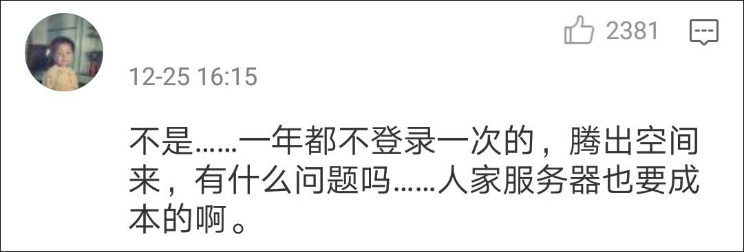 但是有網友依然認為,自己對於自己的賬號擁有支配權,登錄與不登錄都是個人自由,怎麼能夠説不登錄就收回2T免費存儲空間呢?