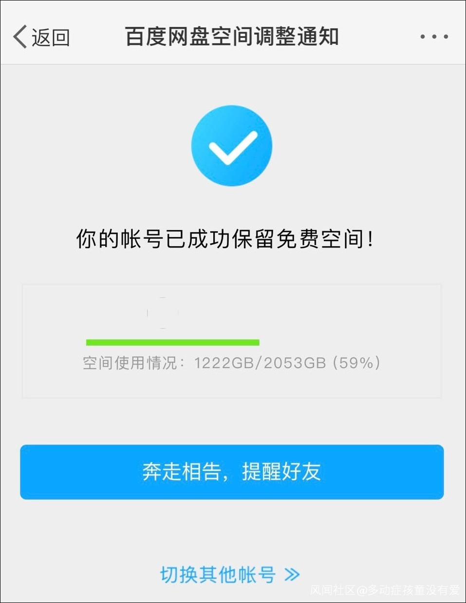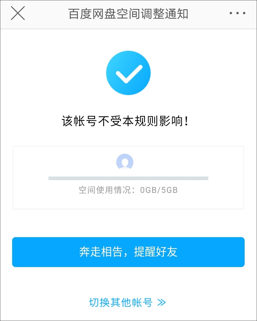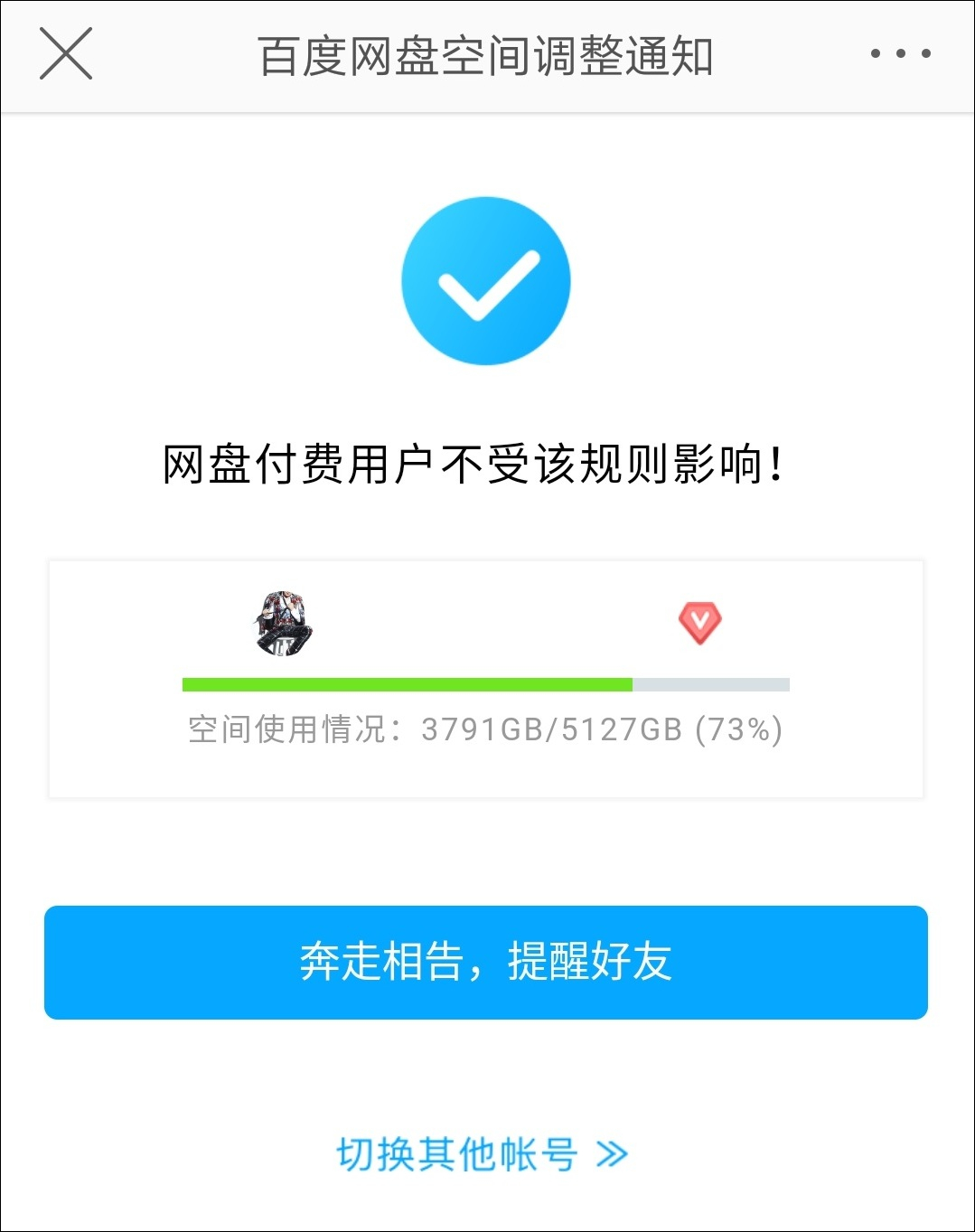 然後在不同的通知頁面上均會提醒,“奔走相告,提醒好友”,也包括提供切換其他賬號的鏈接給擁有多個網盤的特殊用户。