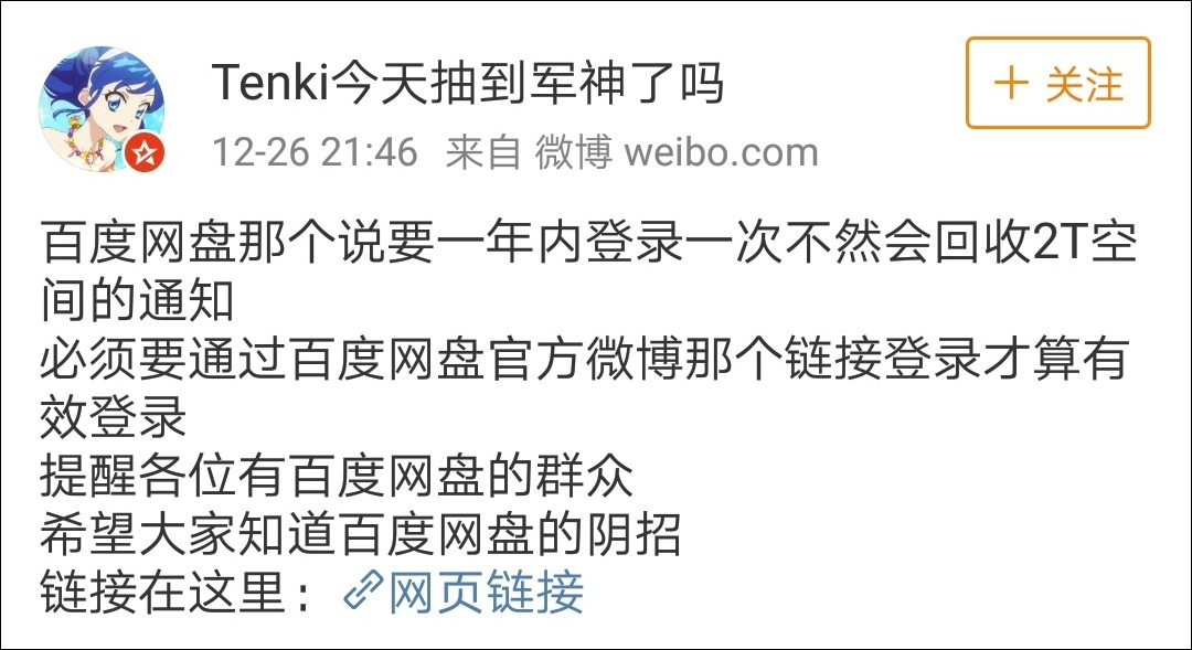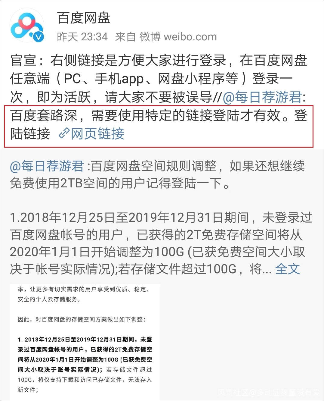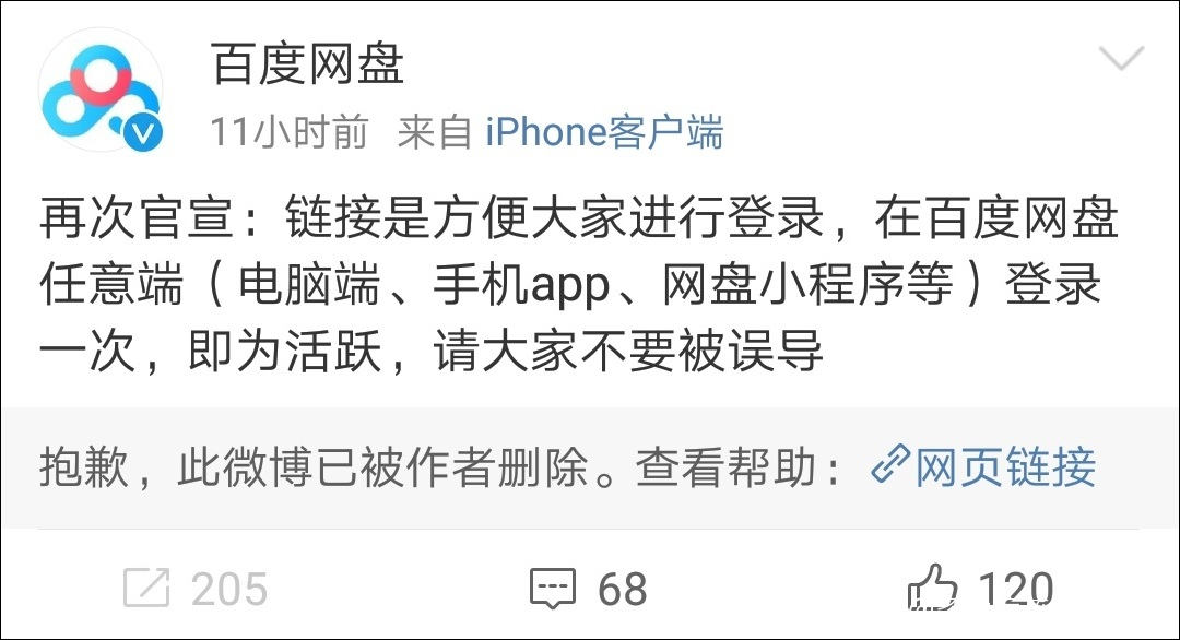 目前,百度網盤已經做出闢謠,微博提供的鏈接只是方便大家在使用社交媒體時看到這份通知就可以很方便地進行登錄了,但這並不是唯一的有效登錄方式,在百度網盤任意端(PC、手機APP、網盤小程序等)登錄一次,都表示已活躍賬號。