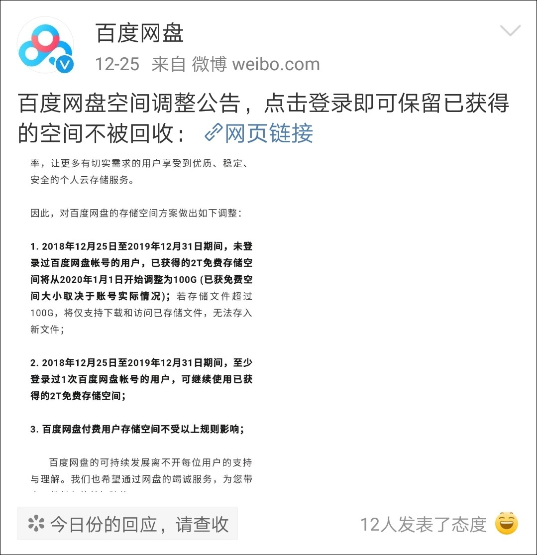 12月25日,百度網盤發佈網盤存儲空間調整通知,把不少用户都嚇得趕緊登錄上自己的網盤去查看。但與此同時,網友發現到底要怎麼樣保留自己的網盤存儲空間語焉不詳,甚至有博主造謠必須通過官方提供的登陸鏈接才有效。