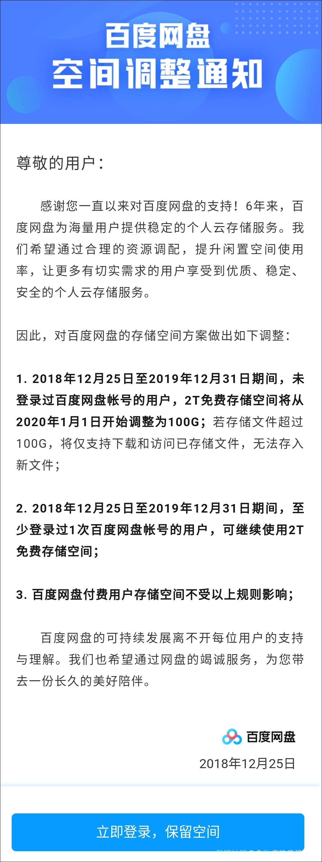 2.2018年12月25日至2019年12月31日期間,至少登錄過1次百度網盤賬號的用户,可繼續使用2T免費存儲空間;