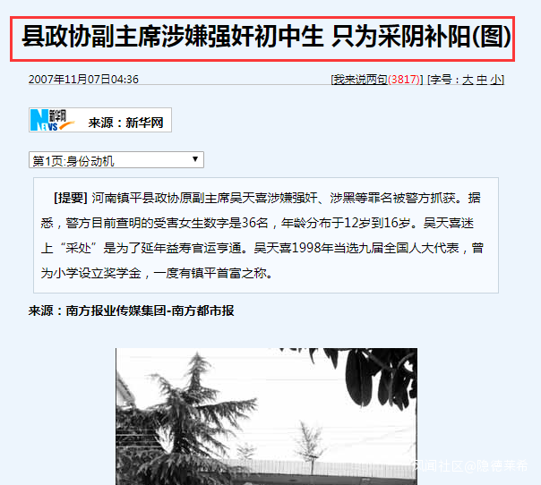 12月21日,筆者看到河南性侵幼女案二審宣判這則新聞,有一個想法,覺得這個性侵案背後或許可以深挖,即性侵女童的這羣人滿足的到底是什麼?是單純對性的滿足嗎?10年前河南某縣政協副主席幹部用性侵女童的方式治療肺病,很多人都忽略其背後的“文化積澱”——巫醫不分。在他看來,女童其實就是一種保健品。