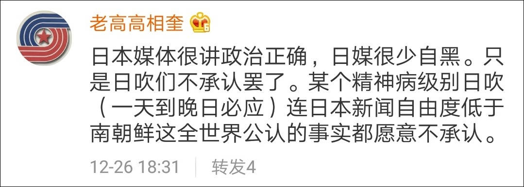 知名大V@老高高高相奎 贊同發文博主的觀點,轉發評論説日本媒體是很講“政治正確”的,即使是純日本人的新聞,也很少“自黑”: