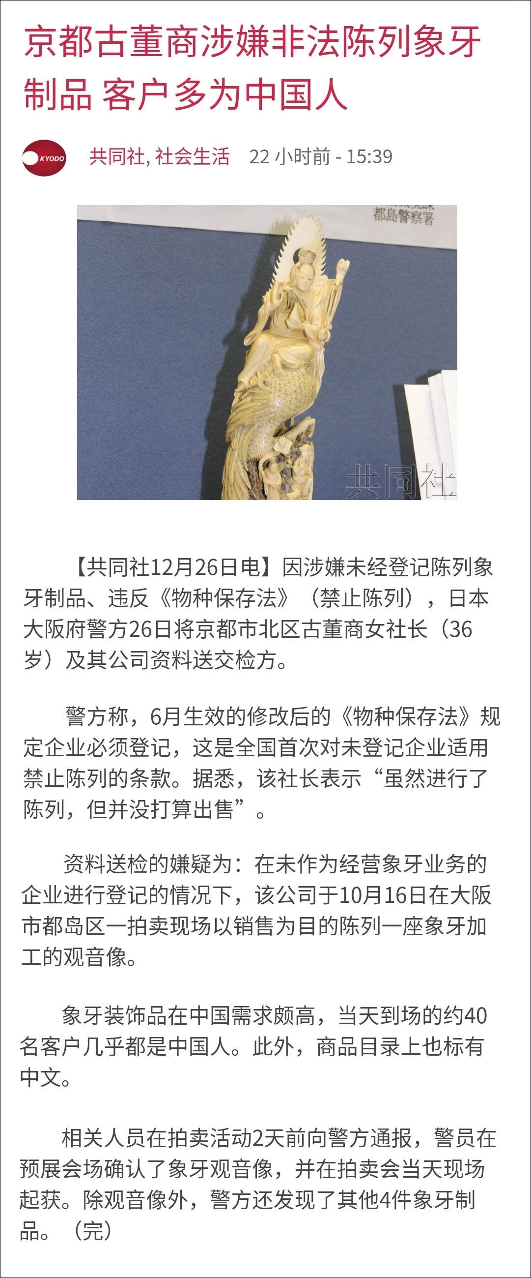 12月26日,知名通訊媒體日本共同社報道了京都市一店家涉嫌非法陳列象牙製品的新聞事件。本是平平無奇的新聞報道,卻因為它的標題中出現“客户多為中國人”的表述,受到了我國網友的指責。