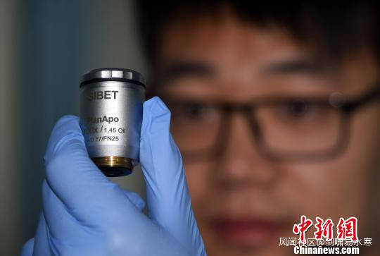 中科院蘇州醫工所科研人員展示介紹研製成功的一款大數值孔徑顯微物鏡。 孫自法 攝