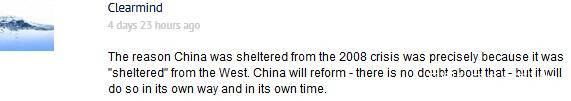 Clearmind:中國之所以能避開2008年金融危機,原因就在於中國擺脱了西方。毫無疑問,中國將會進行改革,不過中國會通過自己的方式、按照自己的節奏進行改革。