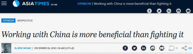 《亞洲時報》12月25日刊文《與中國合作遠勝於與其鬥爭》