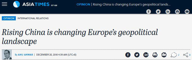 《亞洲時報》12月21日刊文《崛起的中國正在改變歐洲的地緣政治局面》