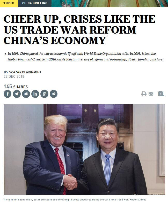 《南華早報》12月22日刊文《中美貿易摩擦正好便於中國改革經濟》