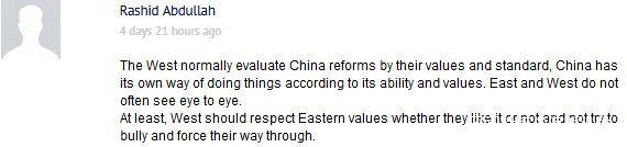 Rashid Abdullah:西方在看待中國改革時使用的往往都是自己的價值觀和判斷標準。根據其能力和價值觀,中國也有自己做事情的方式。西方和東方很少有觀點一致的時候。無論喜不喜歡,西方至少應該尊重東方的價值觀,西方不應強迫東方接受自己的那一套東西。