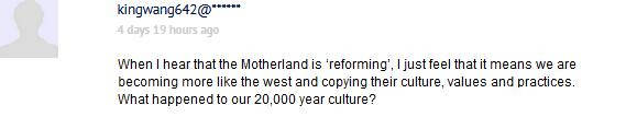 kingwang642:當我聽到祖國在“改革”的時候,我聯想到的卻是我們正在變得西化,我們模仿西方人的文化、價值觀和行為方式。我們兩萬年的文化呢?