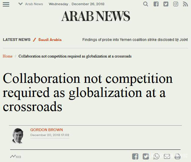 《阿拉伯新聞》網站12月20日刊文《全球化處於十字路口,需要協作而不是競爭》