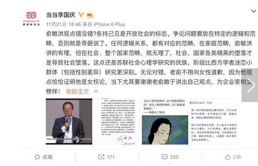 此話一出,即引發軒然大波。俞敏洪被罵得狗血噴頭,體無完膚。其他人避而遠之,生怕惹禍上身。李國慶冒天下之大不韙,站了出來,在朋友圈發文力挺,稱“俞敏洪觀點錯沒錯?各持己見是開放社會的標誌。無論對錯,老俞不用向女性道歉,因為他的觀點恰恰證明他是女權論,當下尤其要謝謝老俞敢於講出自己觀點,為企業家樹立榜樣!”