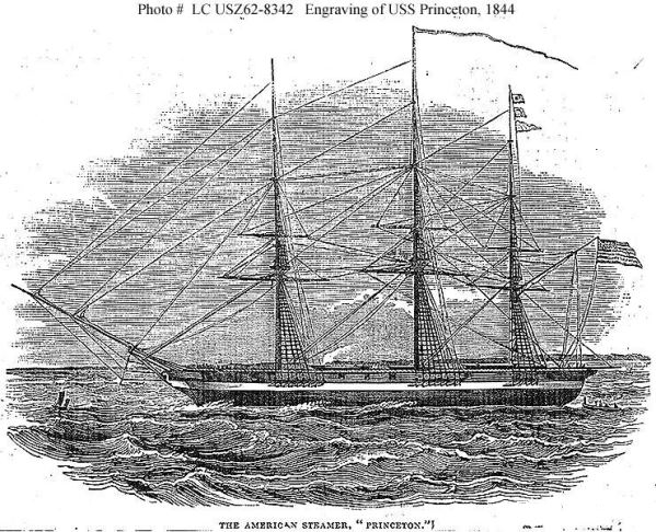 USS Princeton在1843年九月開始在名義上服役,在十一月進入正式執勤,但是一直到1844年一月才接收了前述的兩門主炮。然後在二月27日,一直鼓吹建造大海軍以參加殖民競賽的Tyler總統受邀檢視USS Princeton;一同來訪的還有國務卿Upshur、海軍部長Gilmer、前總統Madison的遺孀、一眾國會議員等等。