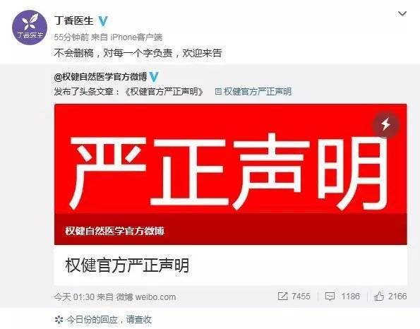 而她的母親則發了一篇**《比謠言更可怕的是打着科普旗號偽闢謠,丁香醫生,請住嘴》**的文章作為回應。