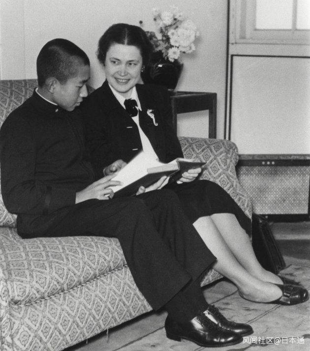 在和家庭教師瓦伊寧夫人(右,已故)學習英語的日本天皇。瓦伊寧夫人的教育理念是“人人平等”,在補習中班上課時,為他起了“Jimmy”的英文名字。