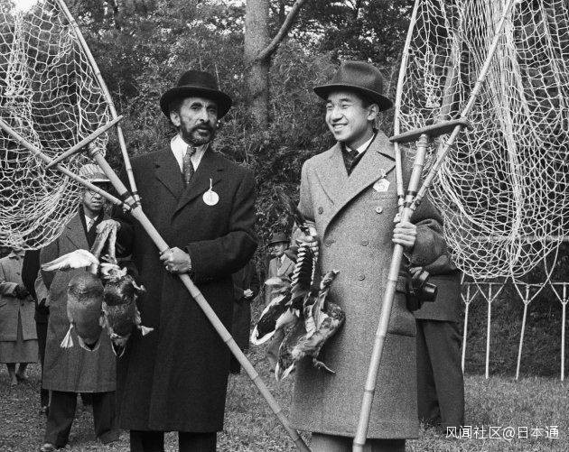 二戰後,與第一次作為外國元首訪日的埃塞俄比亞皇帝,海雷·陶瓷(左·當時)一起捕獵鴨子。