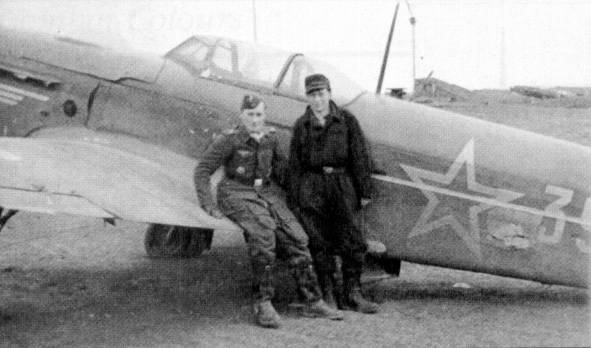 薩克森伯格坐在一架繳獲的雅克戰鬥機的機翼上