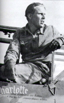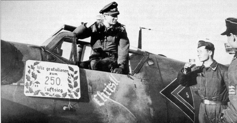 巴克霍恩擊落第250架敵機返航後在慶祝勝利,機身上的Christl是他妻子的名字,巴克霍恩總是在他的飛機上塗“幸運的5號”