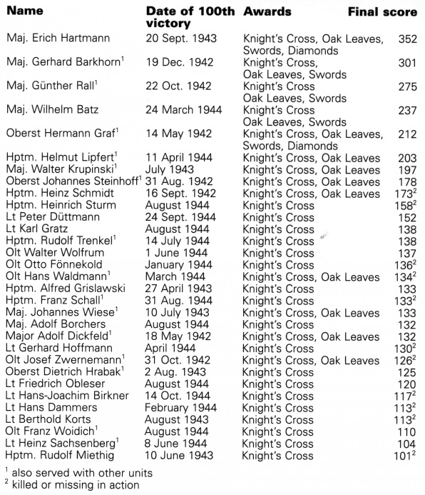 1944年1月達到100架紀錄的超級王牌芬尼科爾德(Otto Fonnekold)軍士是1942年加入JG52的,由於作戰勇敢、功勳卓著,最終被晉升為上尉。芬尼科爾德在羅馬尼亞-匈牙利邊境的一個機場正在着陸時,遭到從意大利出擊的流竄的美國P-51戰鬥機的狙擊,被擊落喪命,最終紀錄為136架。