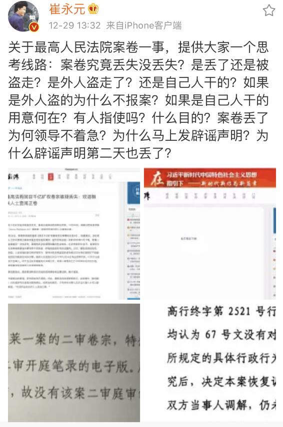 2018年12月29日13時32分,微博賬號“崔永元”發博文並附四張圖片。經核實,其中兩張圖片所載內容與目前保存在最高人民法院檔案處的(2011)民一終字第81號案件副卷的有關內容相同(其他兩張為媒體報道截圖)。