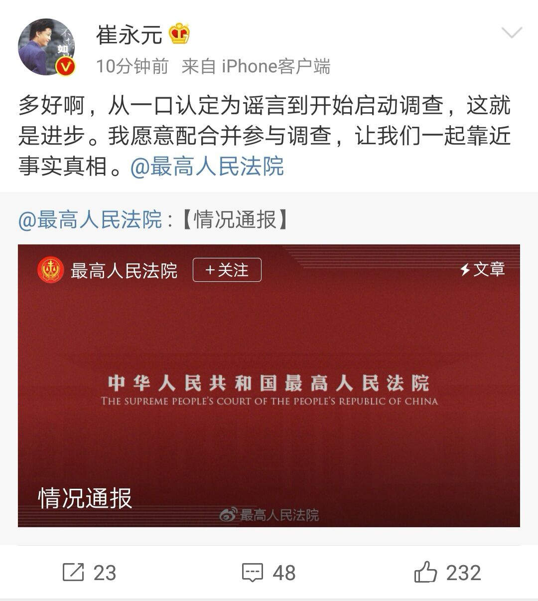 我們已經啓動調查程序,歡迎崔永元教授等知情人向我們提供情況。如發現我院工作人員違反審判紀律問題,將依紀依法嚴肅處理。
