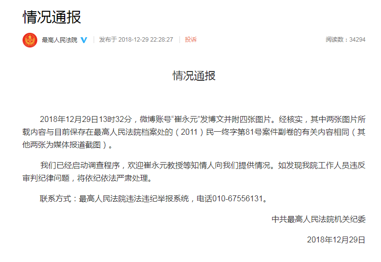 對此,@最高人民法院 12月29日晚發佈情況通報:其中兩張圖片所載內容與目前保存在最高人民法院檔案處的有關內容相同,已經啓動調查程序,歡迎崔永元教授等知情人提供情況。如發現我院工作人員違反審判紀律問題,將依紀依法嚴肅處理。