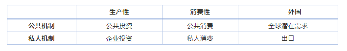 在資本主義經濟體制下,社會總需求不外乎“三駕馬車”,投資、消費、出口。在社會主義市場經濟體制下可以增加一個私人與公共的分類維度。這樣,“三駕馬車”就成為**“六駕馬車”:公共投資、公共消費、全球潛在要求,企業投資,私人消費以及出口。**(見表1)這裏的公共與私人的分類維度,不是從需求的部門進行分類,而是從潛在需求實現的機制進行劃分,公共投資與公共消費,不等價於而是包含了政府購買,是指通過公共機制主導的投資與消費。