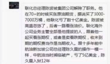 “聯化總經理陳波在原油價格70+的時候買漲原油期貨,據説買了3000—7000萬桶,給聯化虧了數十億美金。陳波被高盛忽悠了,高盛此前一路看漲油價。”