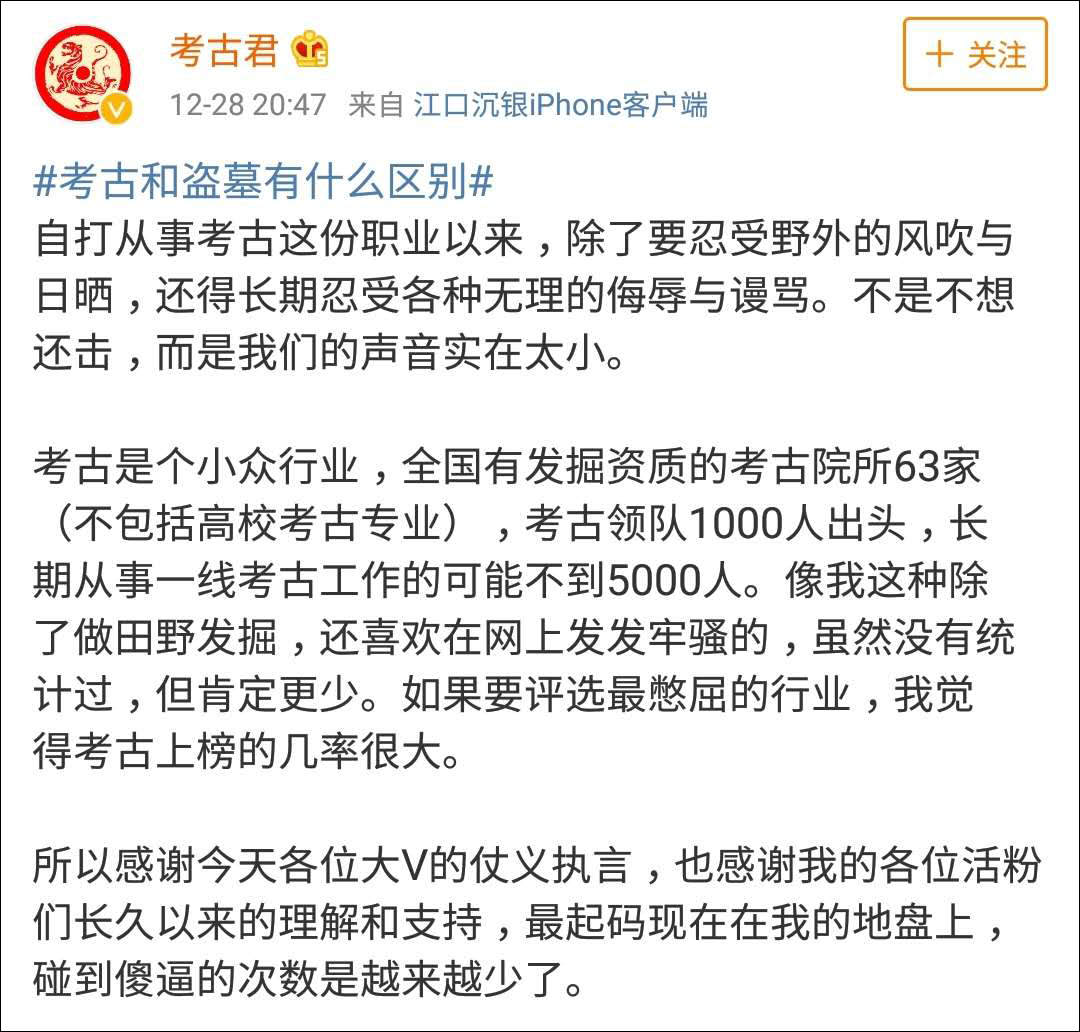 當@考古君 被罵後,有不少大V出來為他仗義執言,他在微博中也表示了感謝。