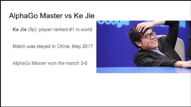 2015年,位於倫敦的谷歌(Google)旗下DeepMind公司開發出人工智能機器人阿爾法狗(AlphaGo),這隻“狗”程序能夠利用“價值網絡”計算局面,利用“策略網絡”選擇下子。2015年10月,阿爾法狗以5:0完勝歐洲圍棋冠軍、職業二段選手樊麾;2016年3月,4:1成功擊敗圍棋世界冠軍李世石九段。其後取名master的新版本挑戰各路高手60局,毫無懸念全勝。2017年5月,master挑戰柯潔,3:0完勝。