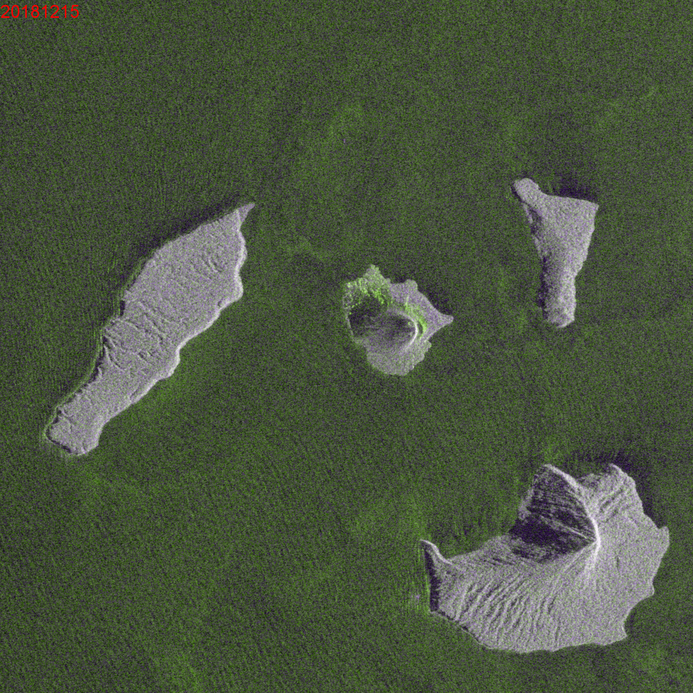 該海嘯是由火山噴發,導致泥石直接衝擊海水導致的。在12月22日(UTC時間)的噴發後,“喀拉喀託之子”火山繼續活躍。我們一直試圖通過各種衞星手段獲取它目前的形貌。但是因為當地長期雲霧覆蓋,光學衞星無法使用。雖然雷達衞星雖然一般都説能夠穿雲透霧,但是其主要原理是微波波長較長可以不受小顆粒的影響,但是火山噴發的顆粒其大小已經會影響到C波段微波的觀測。