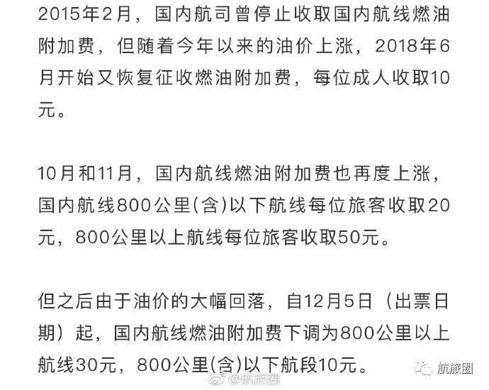 根據發改委、民航局關於完善民航燃油附加聯動機制的要求,燃油附加費徵收標準達到調整條件,調整如下:自2019年1月5日(出票日期)起,國內所有航線燃油附加費免徵收。