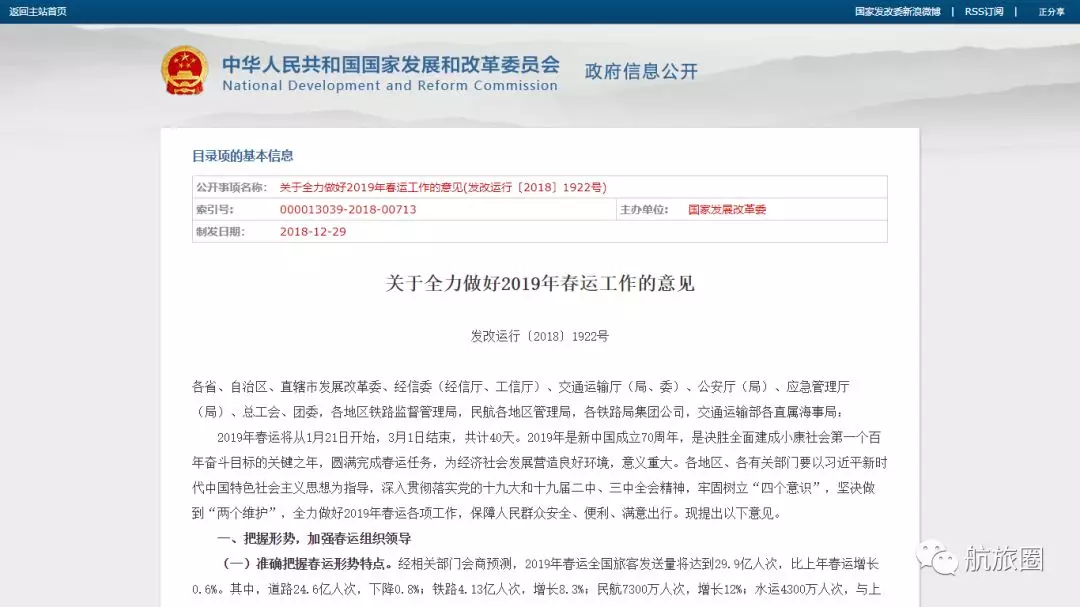 國家發改委等部門日前聯合發佈《關於全力做好2019年春運工作的意見》。《意見》預測2019年春運全國旅客發送量將達到29.9億人次,其中民航旅客發送量預計達到7300萬人次、增長12%。