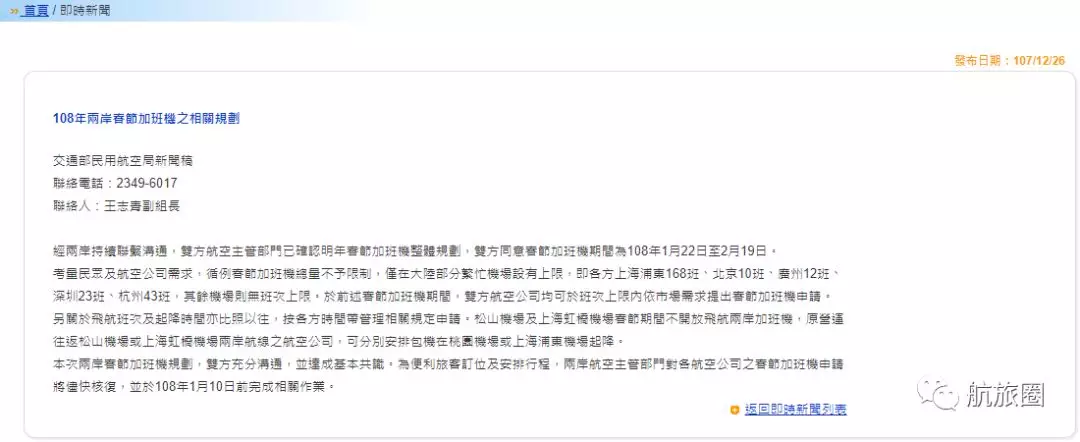 台“民航局”稱,目前兩岸航空主管部門已確認明年春節加班機整體規劃,雙方同意春節加班機期間為2018年1月22日至2月19日。雙方航空公司均可於班次上限內依市場需求提出春節加班機申請。
