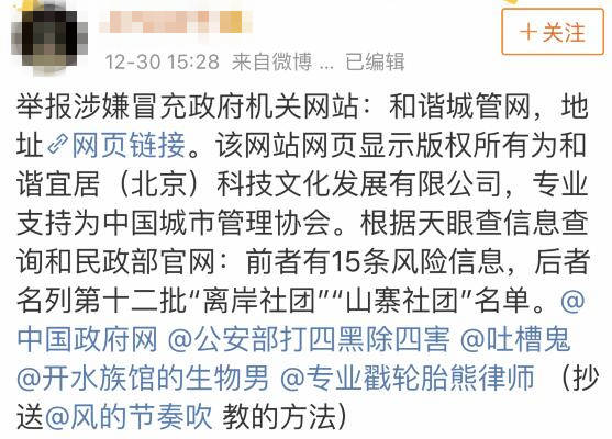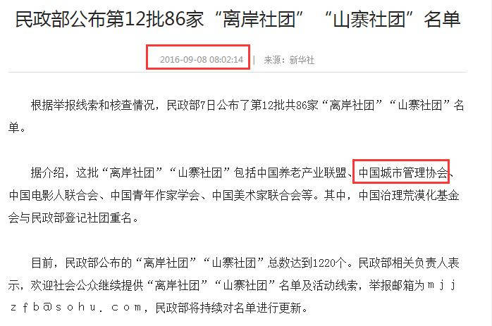隨後,又有網友曝出猛料,跟和諧城管網相關聯的“中國城市管理協會”,被列入民政部第十二批“離岸社團”“山寨社團”名單。