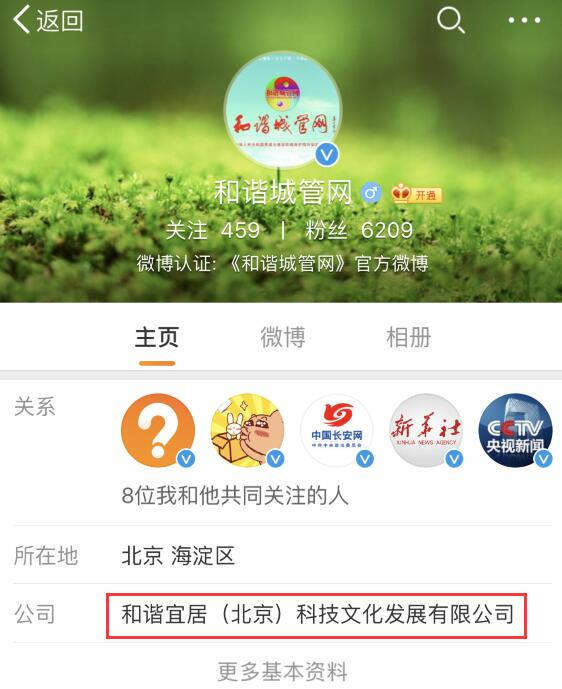 在“和諧城管網”的主頁,我們可以看到,其擁有微博的“藍V官方認證”,公司信息和網友爆料相同,為“和諧宜居(北京)科技文化發展有限公司”。