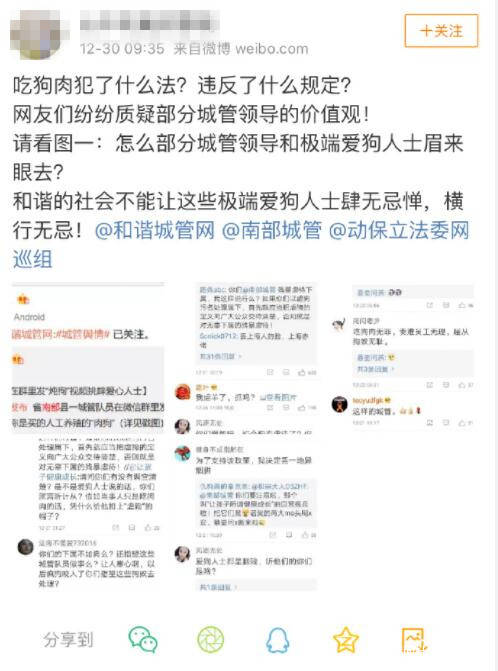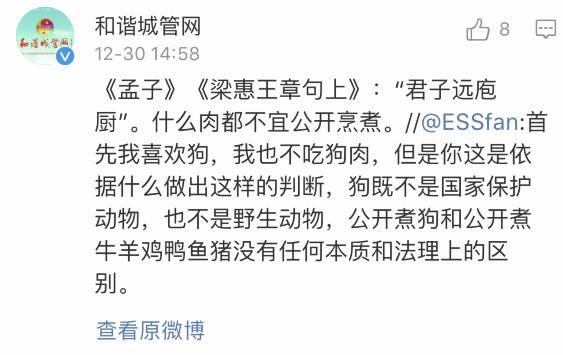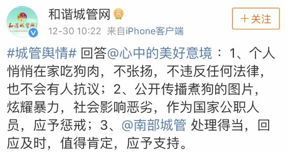 今天下午,我們關注了四川南部縣城管傳播“燉狗”視頻被停職的新聞,不少網友都對此舉表示不滿,認為城管隊員並沒有做錯什麼。