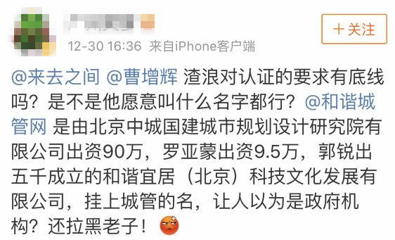 有人質疑,ID為“和諧城管網”的微博賬號,實際上背後是北京中城國建城市規劃設計研究院有限公司出資90萬、羅亞蒙出資9.5萬,郭鋭出資5000的和諧宜居(北京)科技文化發展有限公司,掛上城管的名,讓人以為是政府機構。