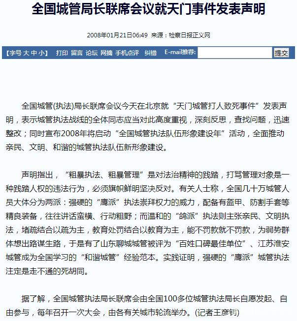 2008年1月,在“天門事件”發生後,“聯席會議”發表了一則聲明,承諾文明執法。