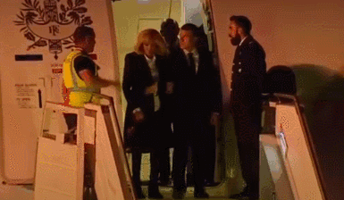 馬克龍靈機一動,與舷梯上一名身着黃馬甲的機師親切握手,巧妙化解尷尬。