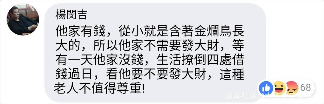 不過,很多台灣網民卻是諷刺説,從小就含着金湯匙長大的辜寬敏不知道是哪裏來的資格説,看不起因為錢而投票給韓國瑜的年輕人。