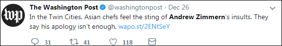 美國大廚安德魯·席莫因為太熱愛中餐,在採訪中diss美式中餐被罵慘,並因此丟掉了王牌節目。11月,美國著名美食欄目主持人安德魯·席莫在採訪中説到,他認為自己正在“拯救美國人民的靈魂,讓他們不用再忍受那些假中餐館”。